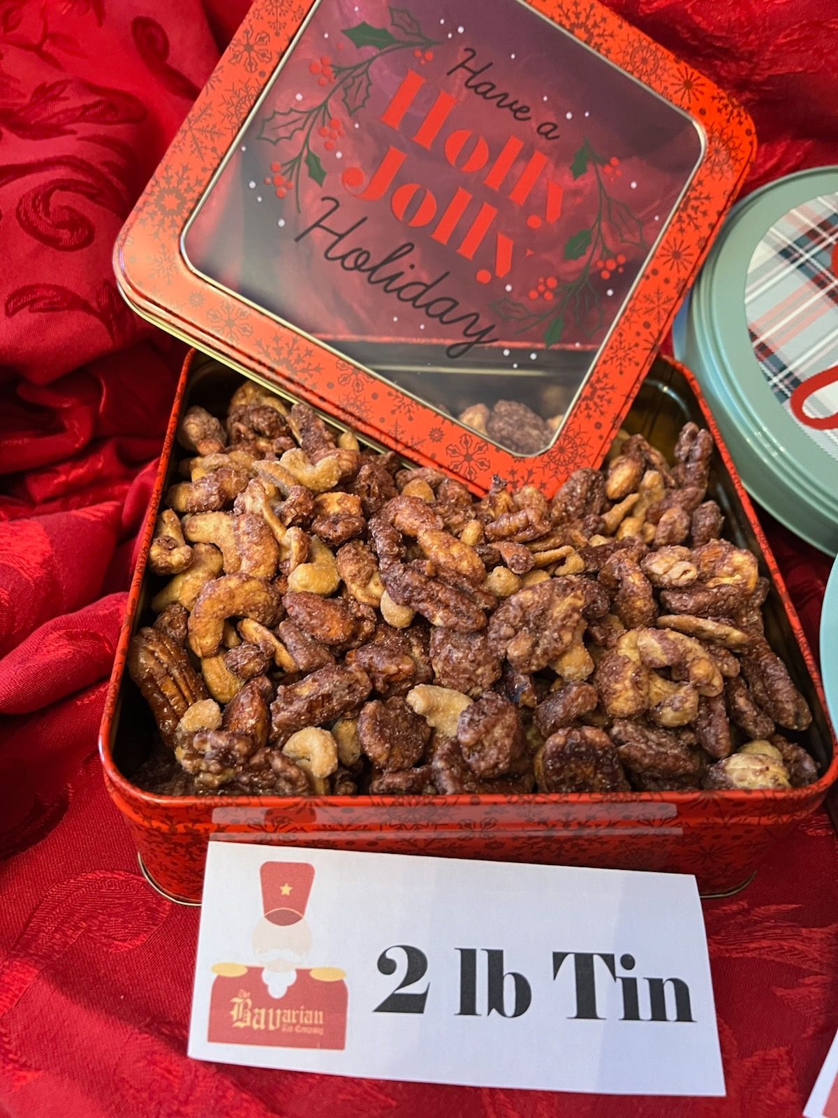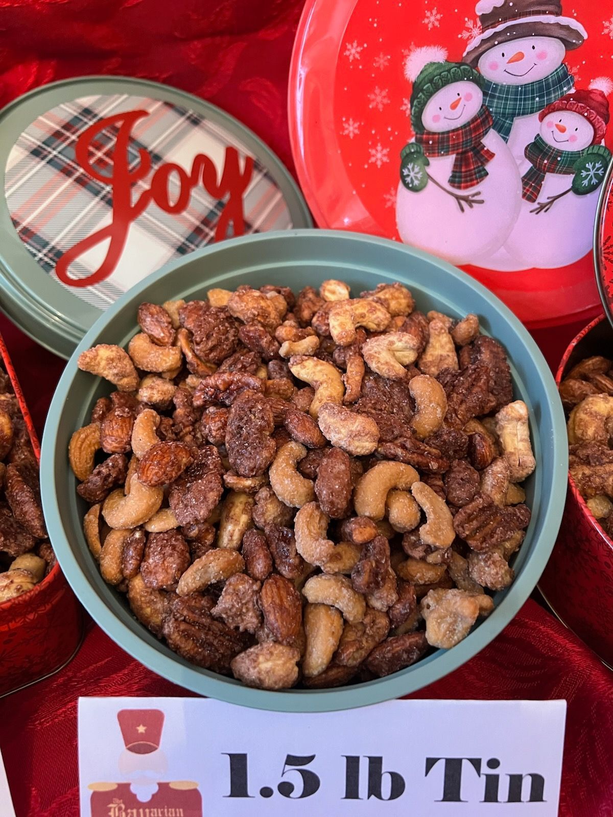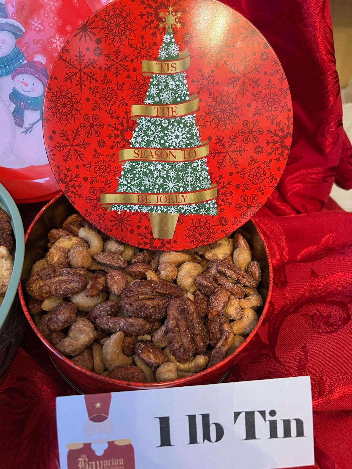 Now featured on our cover page and available just like our tree bags! These festive tins are packed with a delicious mix of cinnamon-glazed Almonds, Pecans, Cashews, and Honey Cashews — perfect for gifting or sharing.